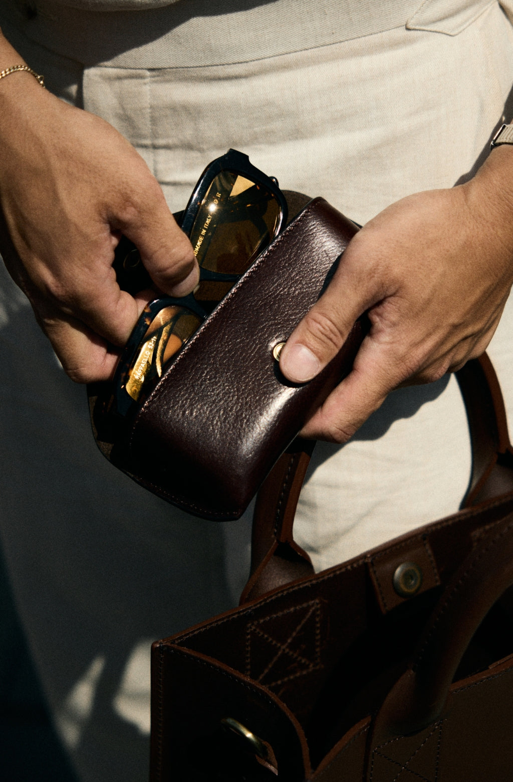 Time Resistance bags and accessories are crafted from premium full-grain, hand-dyed, vegetable-tanned Italian cowhide, known as Vachetta leather, which develops a beautiful patina and ages gracefully over time.